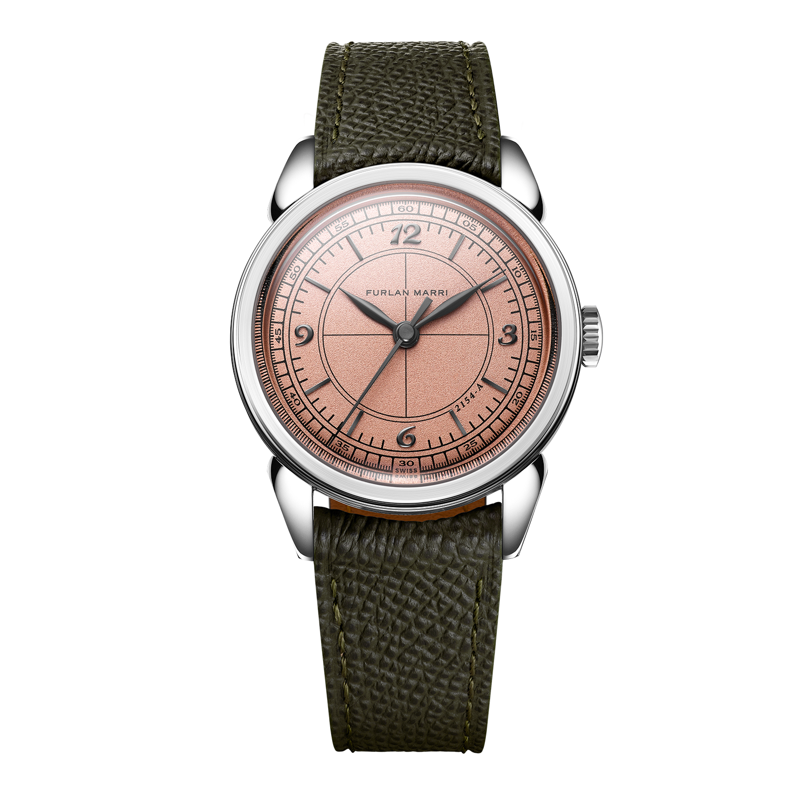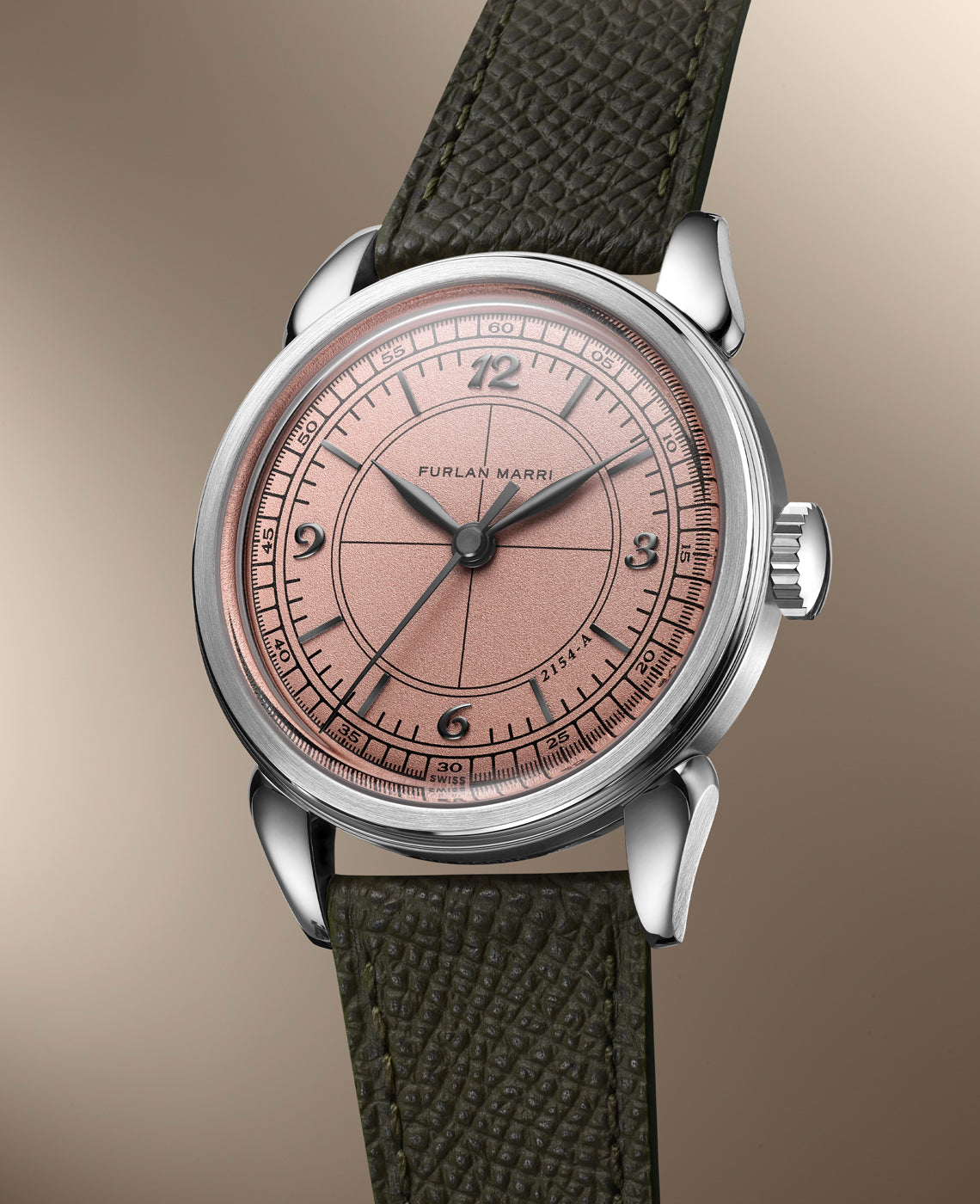 「牛の角」ラグを備えた3針のみの腕時計。精巧な仕上げが施されたスイス製ラ・ジュ・ペレ社製自動巻きムーブメントを搭載しています。ケースバック内側の「ペルラージュ」装飾、曲線を描く針、アプライドの「ブレゲ」インデックスなど、細部にまでこだわった仕上げが施されています。時計には2本のストラップが付属しています。