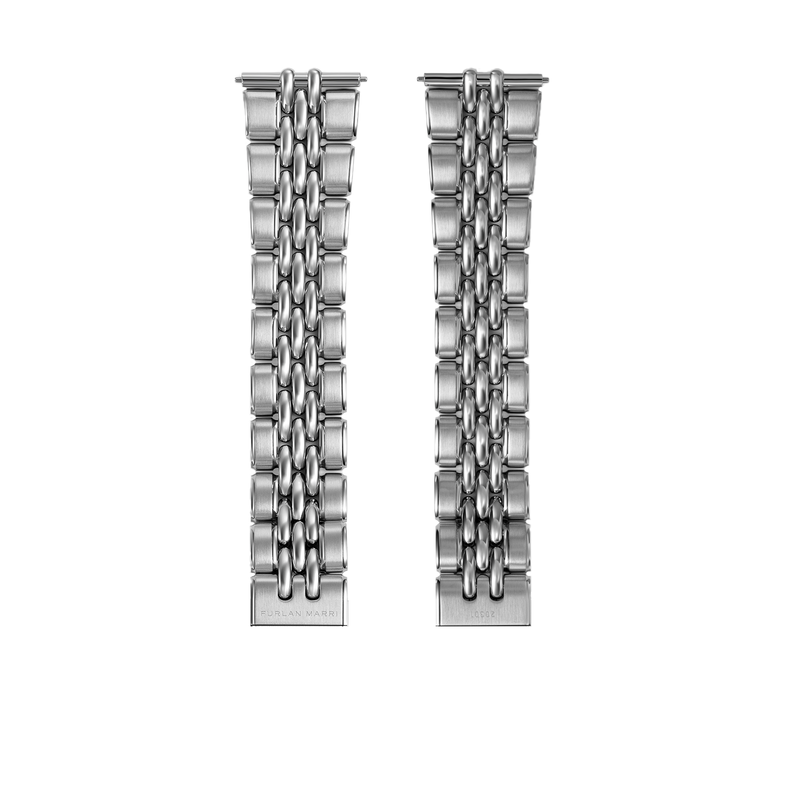 高品質な日本製ステンレススチールを使用したこのBeads of Riceウォッチブレスレットは、面取りされたエッジとブラッシュ仕上げとポリッシュ仕上げの組み合わせが特徴で、洗練されたヴィンテージ風のルックスを演出しています。一体型のクイックリリースシステムにより、Furlan Marriのすべてのウォッチ(Disco Volanteを除く)に簡単に装着でき、快適性、汎用性、そして時代を超越したエレガンスを提供します。